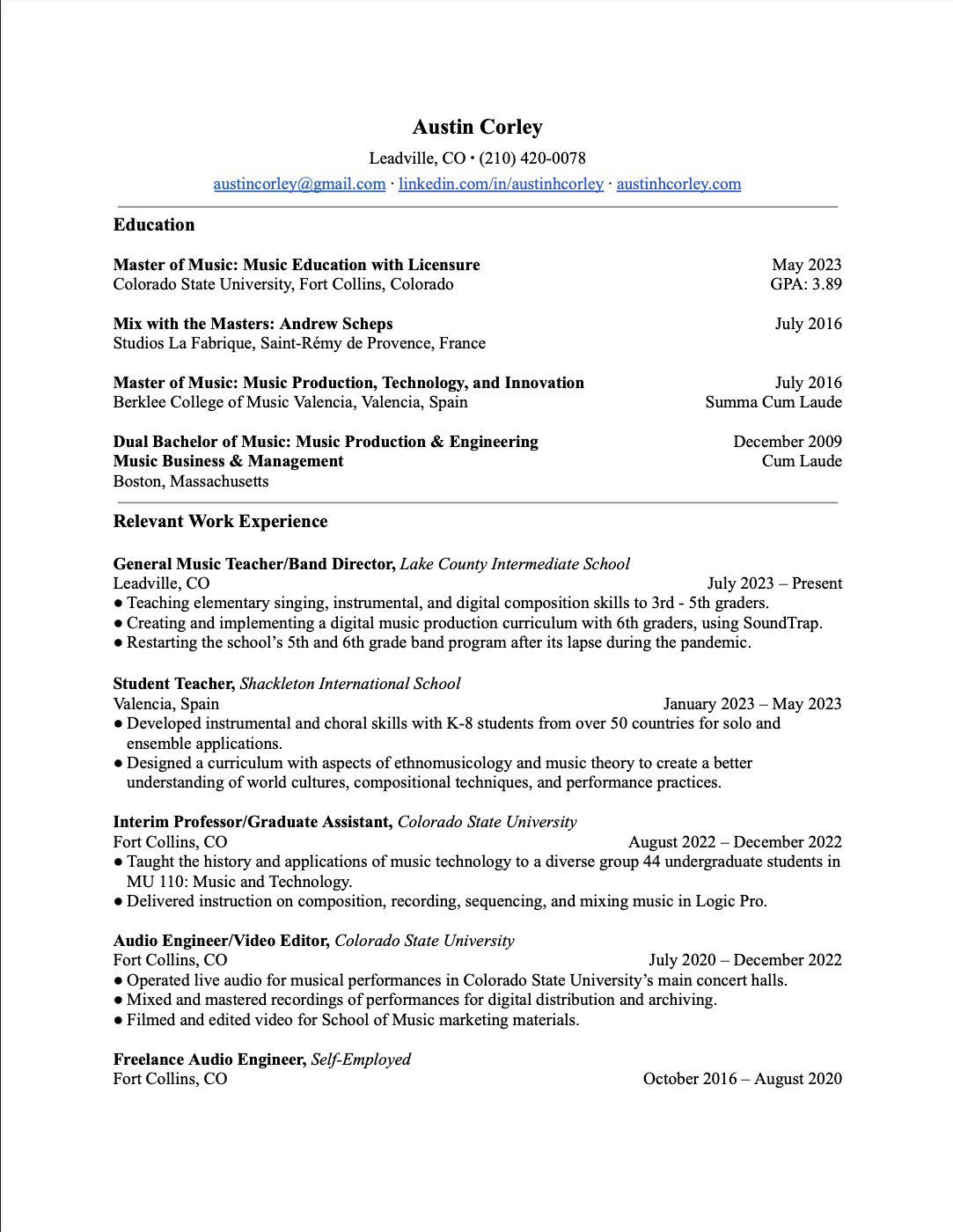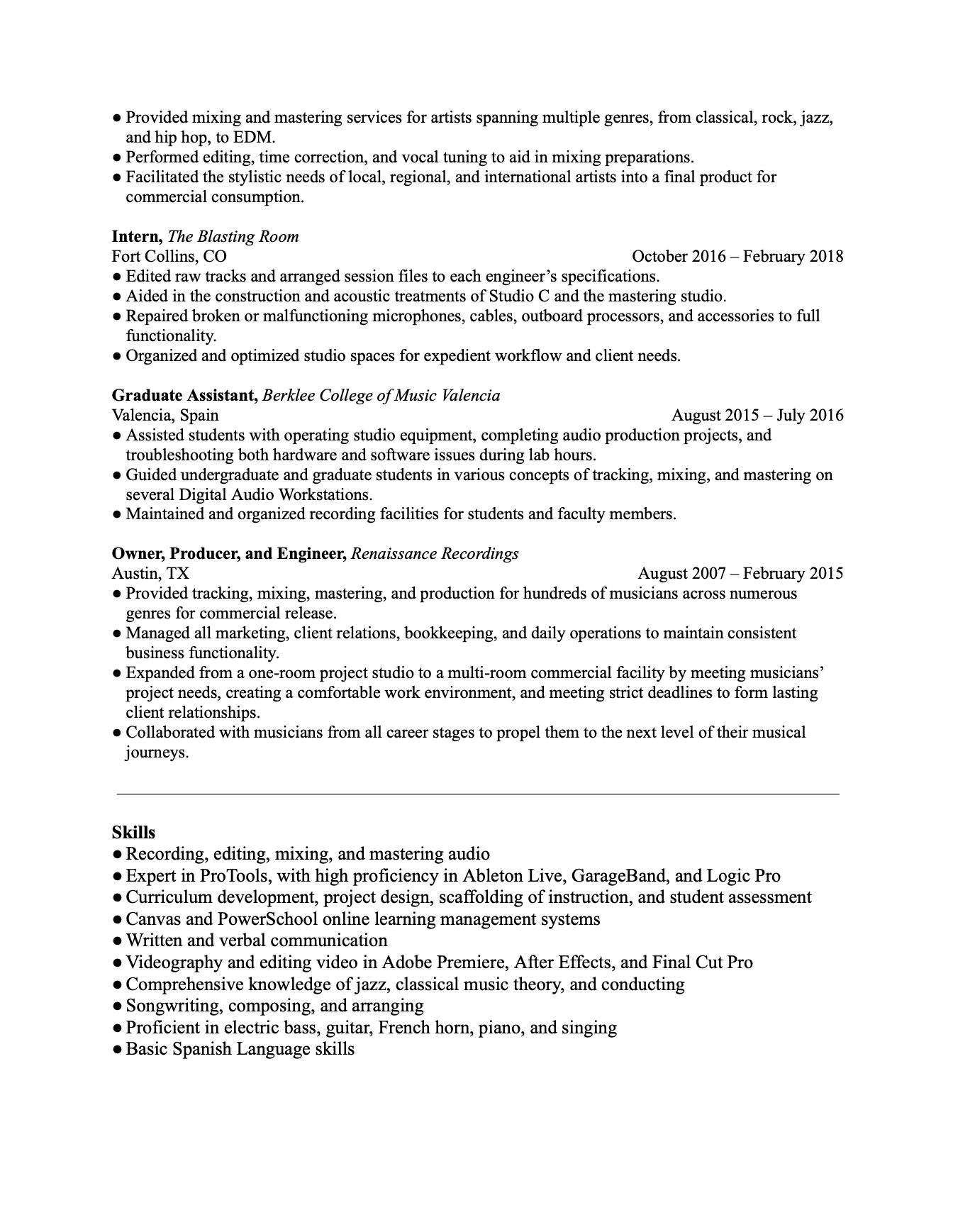 My Culminating Experience video for my Master of Music, Production, Technology, and Innovation degree from Berklee Valencia shows my growth from a Rock producer/engineer to an audio professional who can produce, record, mix, and master an expansive list of genres from around the world.